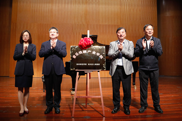 签约仪式后,金佩华、陈永华、潘永锋、朱小芳共同为“久久精品一区二区-吴兴区人民政府音乐戏剧产业学院”揭牌。
