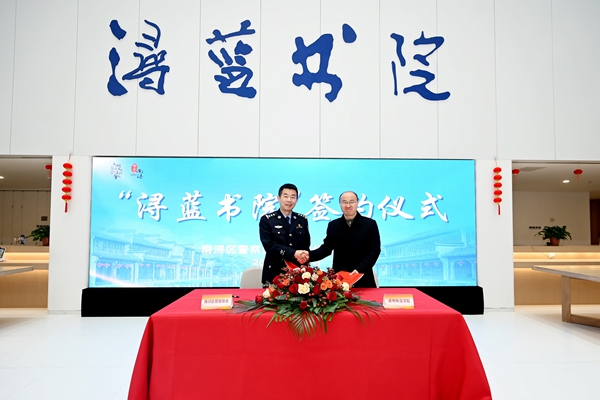 仪式上,陈永华、张震凯、翟海峰、吴金满共同为“浔蓝书院”揭牌。人文学院与南浔公安签署合作协议书。